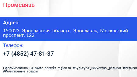 Промсвязь по адресу 150023, Ярославская область, Ярославль, Московский проспект, 122 в дальнейшем Организация, размещена в следующих категориях: