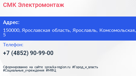 СМК Электромонтаж по адресу 150000, Ярославская область, Ярославль, Комсомольская, 5 в дальнейшем Организация, размещена в следующих категориях: