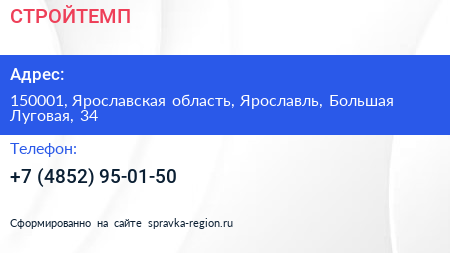 СТРОЙТЕМП по адресу 150001, Ярославская область, Ярославль, Большая Луговая, 34 в дальнейшем Организация, размещена в следующих категориях: