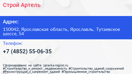 Строй Артель по адресу 150042, Ярославская область, Ярославль, Тутаевское шоссе, 54 в дальнейшем Организация, размещена в следующих категориях:
