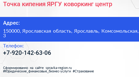 Точка кипения ЯРГУ, коворкинг-центр по адресу 150000, Ярославская область, Ярославль, Комсомольская, 3 в дальнейшем Организация, размещена в следующих категориях: