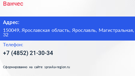 Ванчес по адресу 150049, Ярославская область, Ярославль, Магистральная, 32 в дальнейшем Организация, размещена в следующих категориях:
