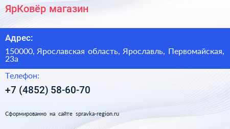 ЯрКовёр, магазин по адресу 150000, Ярославская область, Ярославль, Первомайская, 23а в дальнейшем Организация, размещена в следующих категориях: