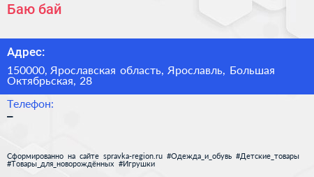 Баю-бай по адресу 150000, Ярославская область, Ярославль, Большая Октябрьская, 28 в дальнейшем Организация, размещена в следующих категориях: