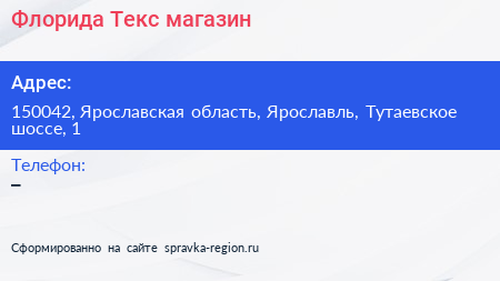 Флорида Текс, магазин по адресу 150042, Ярославская область, Ярославль, Тутаевское шоссе, 1 в дальнейшем Организация, размещена в следующих категориях: