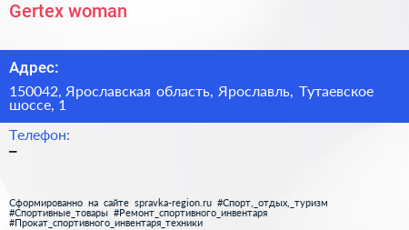 Gertex woman по адресу 150042, Ярославская область, Ярославль, Тутаевское шоссе, 1 в дальнейшем Организация, размещена в следующих категориях: