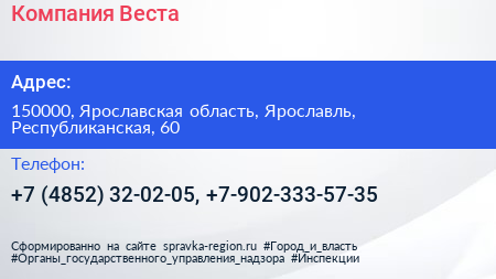 Компания Веста по адресу 150000, Ярославская область, Ярославль, Республиканская, 60 в дальнейшем Организация, размещена в следующих категориях: