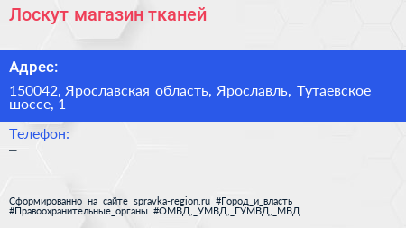 Лоскут, магазин тканей по адресу 150042, Ярославская область, Ярославль, Тутаевское шоссе, 1 в дальнейшем Организация, размещена в следующих категориях: