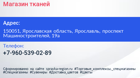 Магазин тканей по адресу 150051, Ярославская область, Ярославль, проспект Машиностроителей, 19а в дальнейшем Организация, размещена в следующих категориях: