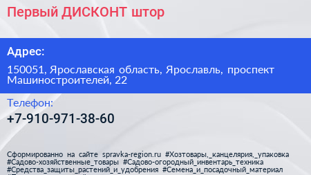 Первый ДИСКОНТ штор по адресу 150051, Ярославская область, Ярославль, проспект Машиностроителей, 22 в дальнейшем Организация, размещена в следующих категориях: