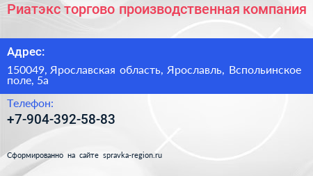 Риатэкс, торгово-производственная компания по адресу 150049, Ярославская область, Ярославль, Вспольинское поле, 5а в дальнейшем Организация, размещена в следующих категориях: