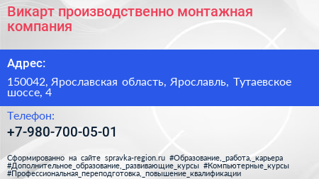 Викарт, производственно-монтажная компания по адресу 150042, Ярославская область, Ярославль, Тутаевское шоссе, 4 в дальнейшем Организация, размещена в следующих категориях: