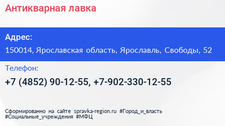 Антикварная лавка по адресу 150014, Ярославская область, Ярославль, Свободы, 52 в дальнейшем Организация, размещена в следующих категориях: