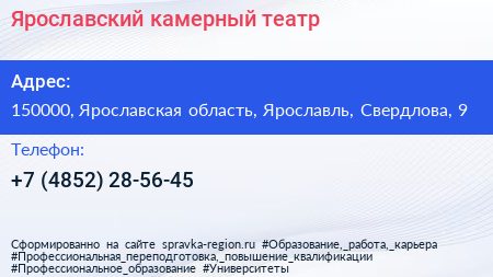 Ярославский камерный театр по адресу 150000, Ярославская область, Ярославль, Свердлова, 9 в дальнейшем Организация, размещена в следующих категориях: