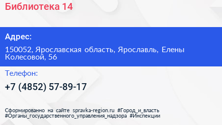 Библиотека №14 по адресу 150052, Ярославская область, Ярославль, Елены Колесовой, 56 в дальнейшем Организация, размещена в следующих категориях: