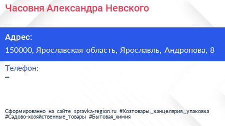 Часовня Александра Невского по адресу 150000, Ярославская область, Ярославль, Андропова, 8 в дальнейшем Организация, размещена в следующих категориях: