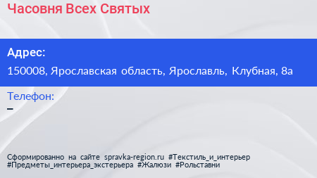 Часовня Всех Святых по адресу 150008, Ярославская область, Ярославль, Клубная, 8а в дальнейшем Организация, размещена в следующих категориях: