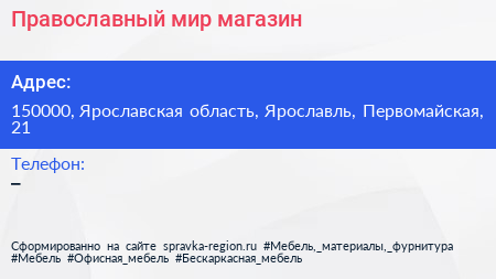 Православный мир, магазин по адресу 150000, Ярославская область, Ярославль, Первомайская, 21 в дальнейшем Организация, размещена в следующих категориях:
