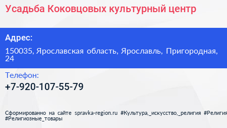 Усадьба Коковцовых, культурный центр по адресу 150035, Ярославская область, Ярославль, Пригородная, 24 в дальнейшем Организация, размещена в следующих категориях: