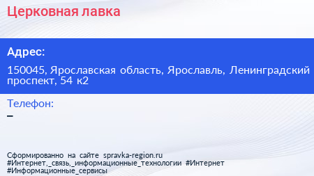 Церковная лавка по адресу 150045, Ярославская область, Ярославль, Ленинградский проспект, 54 к2 в дальнейшем Организация, размещена в следующих категориях: