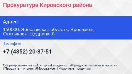 Прокуратура Кировского района по адресу 150000, Ярославская область, Ярославль, Салтыкова-Щедрина, 8 в дальнейшем Организация, размещена в следующих категориях: