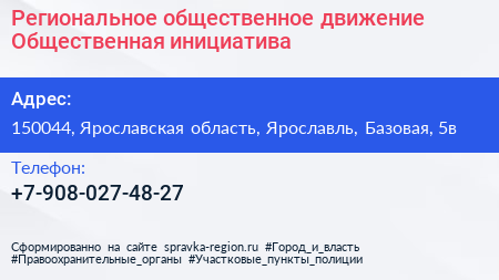 Региональное общественное движение Общественная инициатива по адресу 150044, Ярославская область, Ярославль, Базовая, 5в в дальнейшем Организация, размещена в следующих категориях: