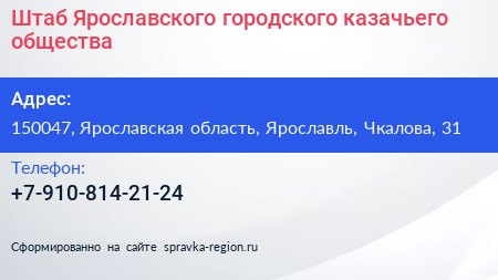 Штаб Ярославского городского казачьего общества по адресу 150047, Ярославская область, Ярославль, Чкалова, 31 в дальнейшем Организация, размещена в следующих категориях: