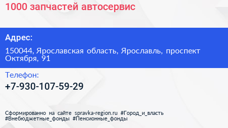 1000 запчастей, автосервис по адресу 150044, Ярославская область, Ярославль, проспект Октября, 91 в дальнейшем Организация, размещена в следующих категориях: