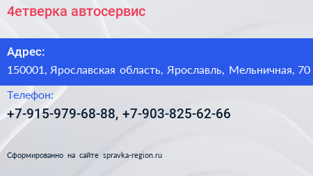 4етверка, автосервис по адресу 150001, Ярославская область, Ярославль, Мельничная, 70 в дальнейшем Организация, размещена в следующих категориях: