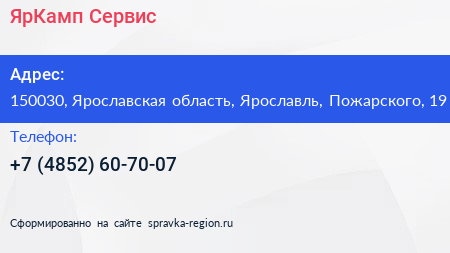 ЯрКамп-Сервис по адресу 150030, Ярославская область, Ярославль, Пожарского, 19 в дальнейшем Организация, размещена в следующих категориях: