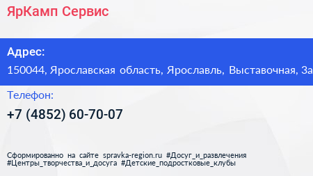 ЯрКамп-Сервис по адресу 150044, Ярославская область, Ярославль, Выставочная, 3а в дальнейшем Организация, размещена в следующих категориях: