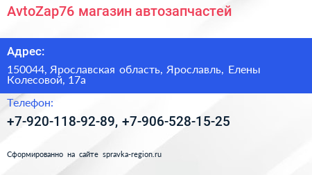 AvtoZap76, магазин автозапчастей по адресу 150044, Ярославская область, Ярославль, Елены Колесовой, 17а в дальнейшем Организация, размещена в следующих категориях: