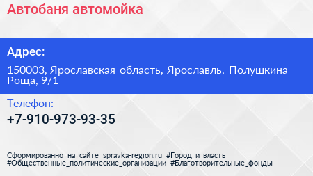 Автобаня, автомойка по адресу 150003, Ярославская область, Ярославль, Полушкина Роща, 9/1 в дальнейшем Организация, размещена в следующих категориях: