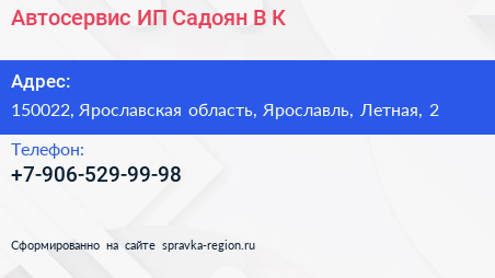 Автосервис, ИП Садоян В.К. по адресу 150022, Ярославская область, Ярославль, Летная, 2 в дальнейшем Организация, размещена в следующих категориях:
