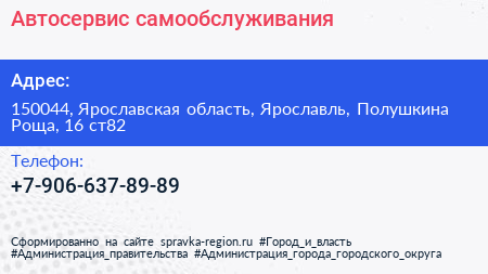 Автосервис самообслуживания по адресу 150044, Ярославская область, Ярославль, Полушкина Роща, 16 ст82 в дальнейшем Организация, размещена в следующих категориях: