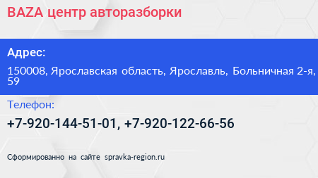 BAZA, центр авторазборки по адресу 150008, Ярославская область, Ярославль, Больничная 2-я, 59 в дальнейшем Организация, размещена в следующих категориях: