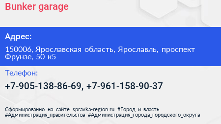 Bunker garage по адресу 150006, Ярославская область, Ярославль, проспект Фрунзе, 50 к5 в дальнейшем Организация, размещена в следующих категориях: