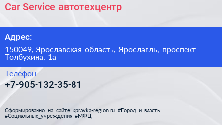 Car-Service, автотехцентр по адресу 150049, Ярославская область, Ярославль, проспект Толбухина, 1а в дальнейшем Организация, размещена в следующих категориях: