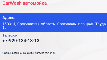 CarWash, автомойка по адресу 150014, Ярославская область, Ярославль, площадь Труда, 1а в дальнейшем Организация, размещена в следующих категориях: