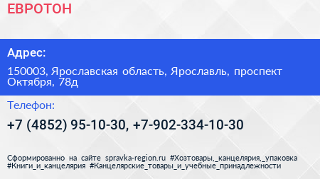 ЕВРОТОН по адресу 150003, Ярославская область, Ярославль, проспект Октября, 78д в дальнейшем Организация, размещена в следующих категориях: