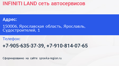 INFINITI LAND, сеть автосервисов по адресу 150006, Ярославская область, Ярославль, Судостроителей, 1 в дальнейшем Организация, размещена в следующих категориях: