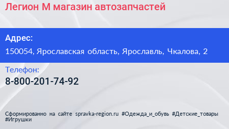 Легион-М, магазин автозапчастей по адресу 150054, Ярославская область, Ярославль, Чкалова, 2 в дальнейшем Организация, размещена в следующих категориях: