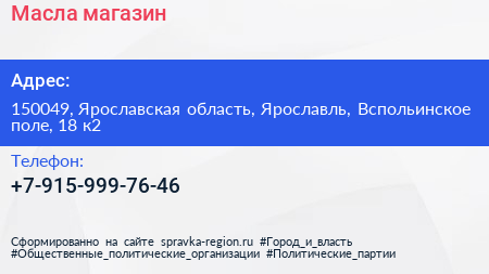 Масла, магазин по адресу 150049, Ярославская область, Ярославль, Вспольинское поле, 18 к2 в дальнейшем Организация, размещена в следующих категориях: