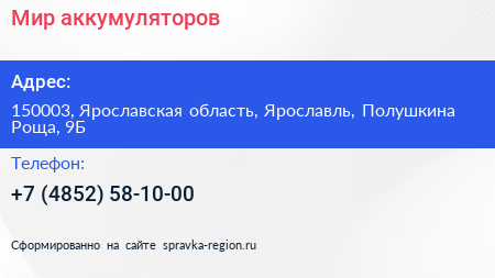 Мир аккумуляторов по адресу 150003, Ярославская область, Ярославль, Полушкина Роща, 9Б в дальнейшем Организация, размещена в следующих категориях: