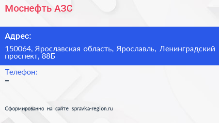 Моснефть, АЗС по адресу 150064, Ярославская область, Ярославль, Ленинградский проспект, 88Б в дальнейшем Организация, размещена в следующих категориях: