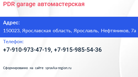 PDR-garage, автомастерская по адресу 150023, Ярославская область, Ярославль, Нефтяников, 7а в дальнейшем Организация, размещена в следующих категориях: