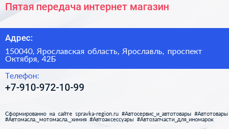 Пятая передача, интернет-магазин по адресу 150040, Ярославская область, Ярославль, проспект Октября, 42Б в дальнейшем Организация, размещена в следующих категориях: