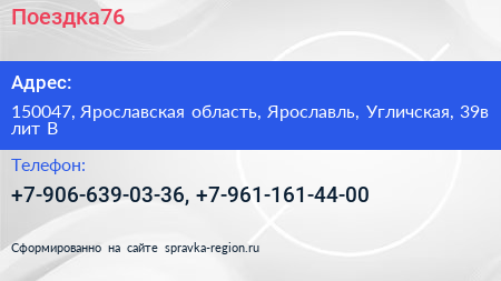 Поездка76 по адресу 150047, Ярославская область, Ярославль, Угличская, 39в лит В в дальнейшем Организация, размещена в следующих категориях: