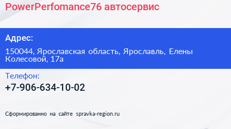 PowerPerfomance76, автосервис по адресу 150044, Ярославская область, Ярославль, Елены Колесовой, 17а в дальнейшем Организация, размещена в следующих категориях: