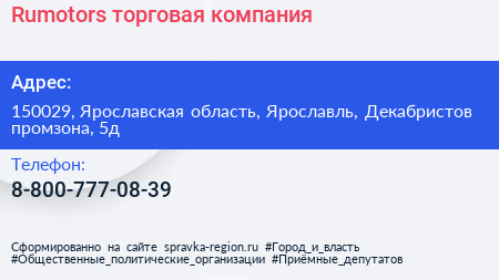 Rumotors, торговая компания по адресу 150029, Ярославская область, Ярославль, Декабристов промзона, 5д в дальнейшем Организация, размещена в следующих категориях: